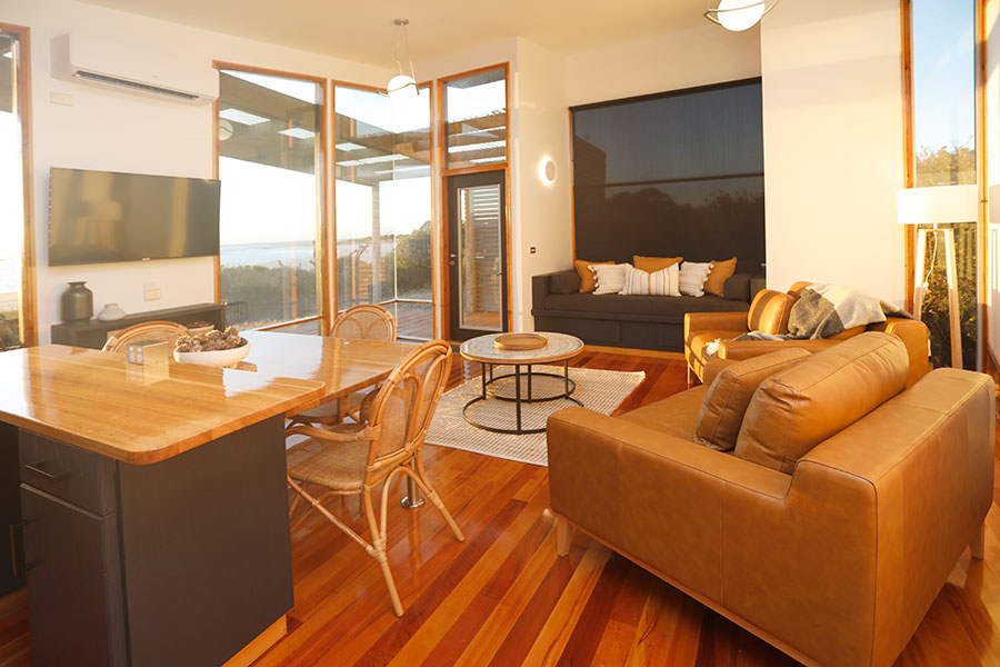 This luxury beach house is situated on the sand dunes with panoramic ocean views.The open-plan designed holiday home has one bedroom with a queen-sized bed, a bathroom with a large modular shower, a spacious kitchen and a lounge/dining area. A glass door opens from the lounge to a large deck with glorious ocean views and private beach access.